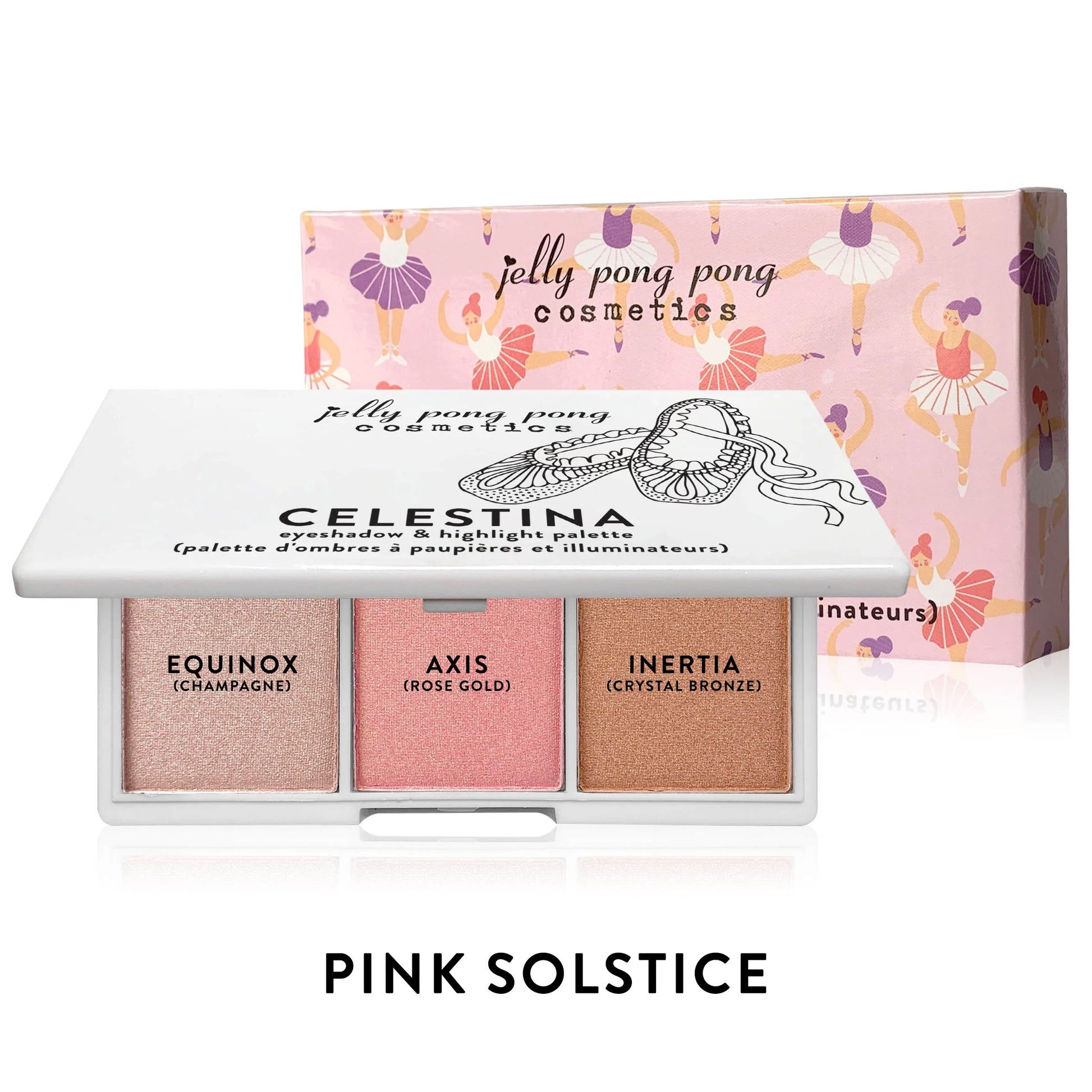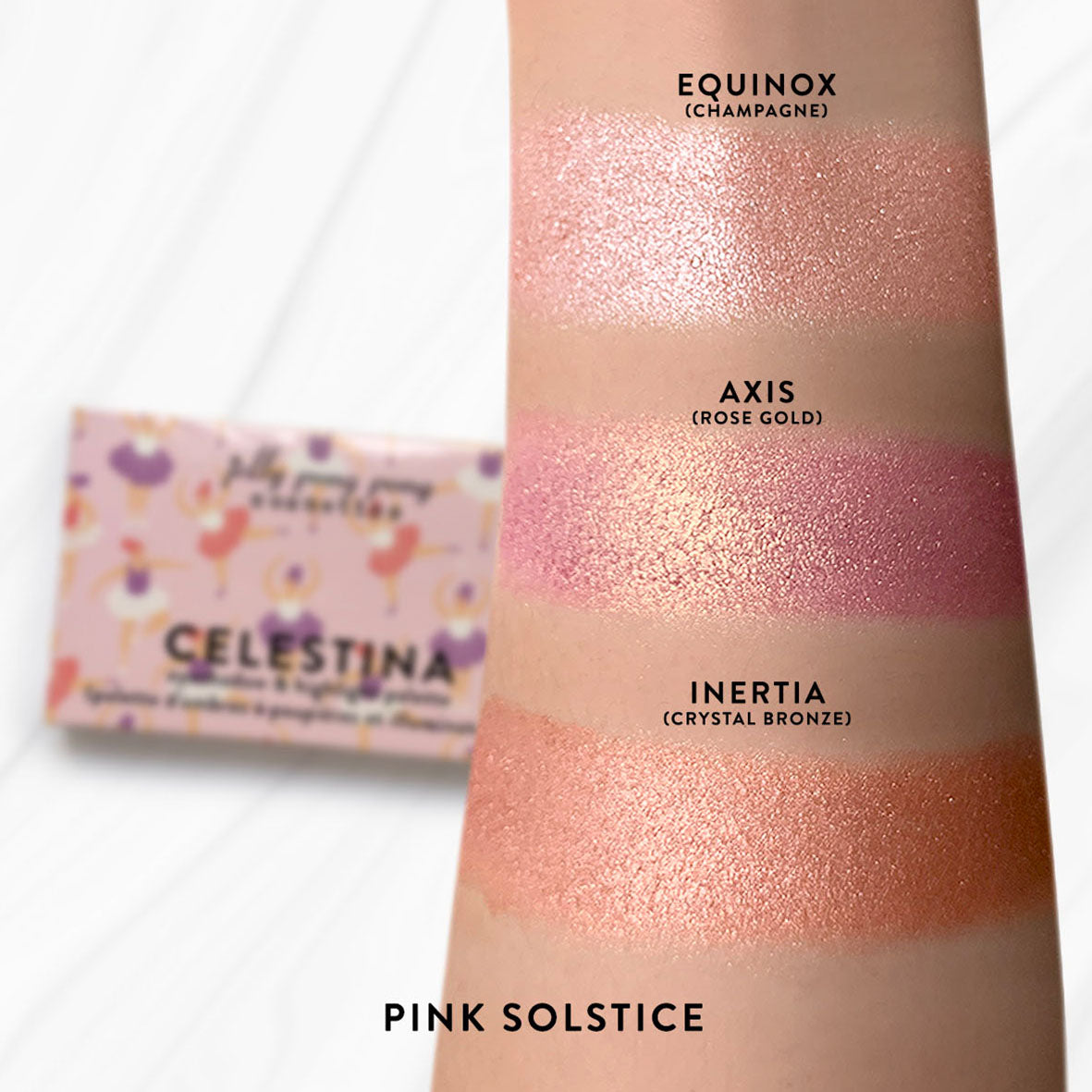 Pink Solstice : synthetic fluorphlogopite, dimethicone, mica, magnesium myristate, prunus domestica (plum) fruit extract, prunus serotina (wild cherry) fruit extract, phenoxyethanol, caprylyl glycol, ethylhexylglycerin. [+/- (may contain / peut contenir) titanium dioxide (CI 77891), iron oxides (CI 77491, CI 77492, CI 77499), red 6 lake (CI 15850), red 27 lake (CI 45410), blue 1 lake (CI 42090), red 40 lake (CI 16035), yellow 5 lake (CI 19140)]