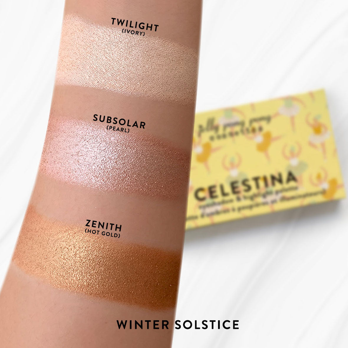 Winter Solstice : mica, dimethicone, magnesium stearate, caprylic/capric triglyceride, boron nitride, aluminum starch octenylsuccinate, silica, ethylhexyl palmitate, triethoxycaprylylsilane, dimethicone/phenyl vinyl dimethicone crosspolymer, vinyl dimethicone, prunus domestica (plum) fruit extract, prunus serotina (wild cherry) fruit extract, phenoxyethanol, vinyl dimethicone/methicone silsesquioxane crosspolymer, ethylhexylglycerin, glyceryl caprylate. [+/- (may contain / peut contenir) titanium dioxide (CI 77891), iron oxides (CI 77491, CI 77492, CI 77499), red 40 lake (CI 16035), yellow 5 lake (CI 19140), tin oxide (CI 77861)]